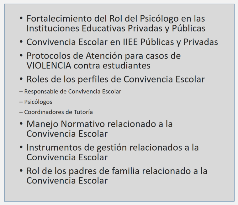 "Este programa de capacitación especializado en Protocolos de Violencia Escolar 2026 ofrece una exégesis detallada de la normativa vigente. Como Especialista de Convivencia Escolar, el Ps. Stewart facilita herramientas para la actualización del Libro de Registro de Incidencias y la gestión de la Ley 29719, garantizando una intervención psicopedagógica con rigor legal y ético en las II.EE. de Lima Provincia ya nivel nacional. " Añade las propiedades exclusivas de tu producto que harán que los clientes quieran comprar. Escribe tu propio texto y ajústalo en las propiedades de la tienda, en la pestaña Estilo.